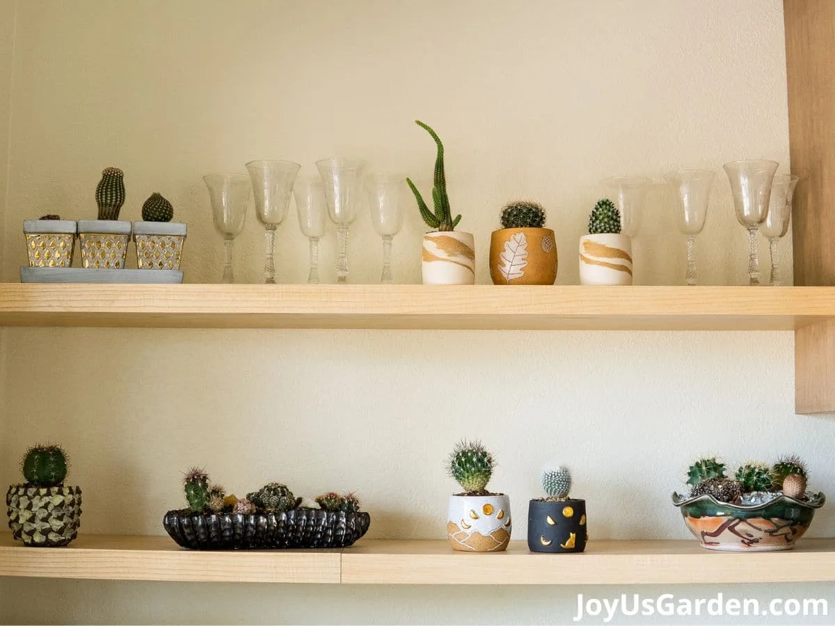 Here’s how often I water the cacti in individual pots and in gardens on the floating shelves in my kitchen: every 2-3 weeks in the warmer summer months and every 3-5 weeks in the winter months. You can get an idea of the sizes of the pots in the photo at the top of this post.