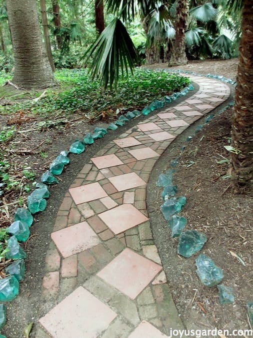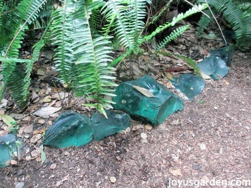These beautiful chunks of turquoise glass that line these paths actually came from a bottled water company in Los Angeles. That was back in the day when water came in glass bottles …