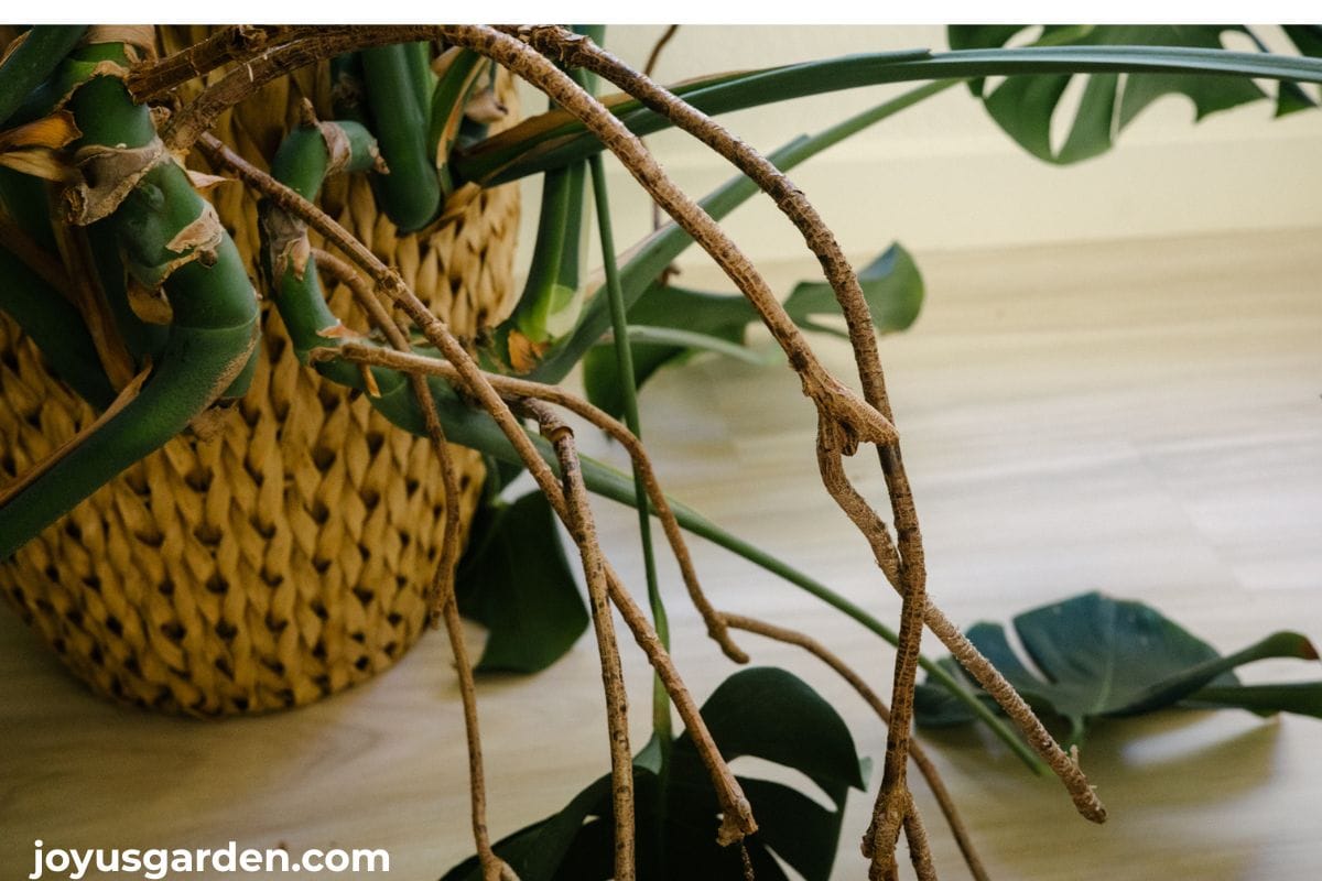 They’re roots that form on the stems, initially growing above the soil instead of below it. This is a natural part of how monsteras grow in the wild. Those wild, stringy roots growing off your plant aren’t a problem—they’re part of what makes them so unique.