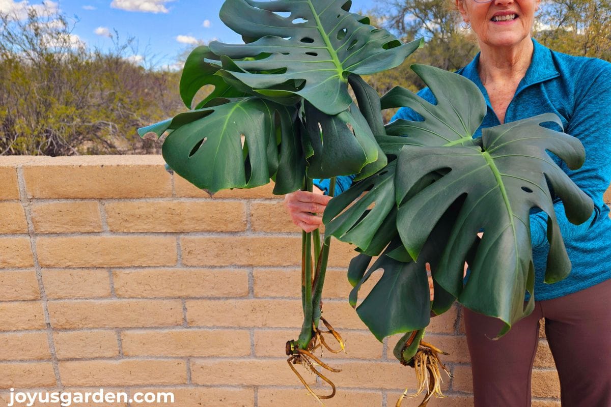 If you’d like more in-depth guidance, check out our post and video on Monstera deliciosa care. In a nutshell, provide bright, indirect light (no direct, hot sun), water when the soil is dry, fertilize during the growing season, and expect to repot every 3 years, because once this plant settles in, it grows fast.