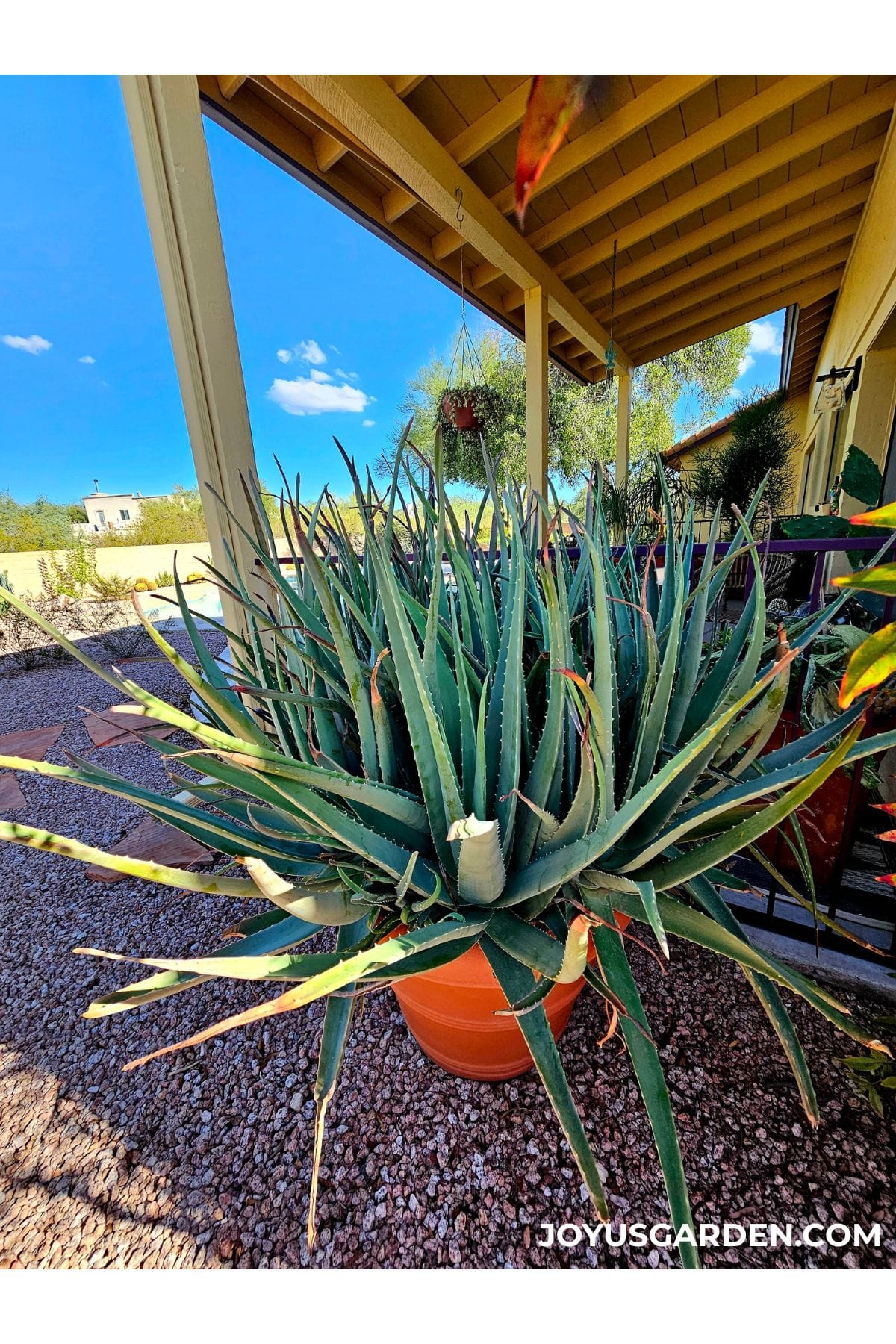 As you’d expect, Aloe vera grows much faster outdoors—especially here in Tucson, where mine is in bright shade, protected from full sun. My plant has produced plenty of pups and the pot is crammed tight!