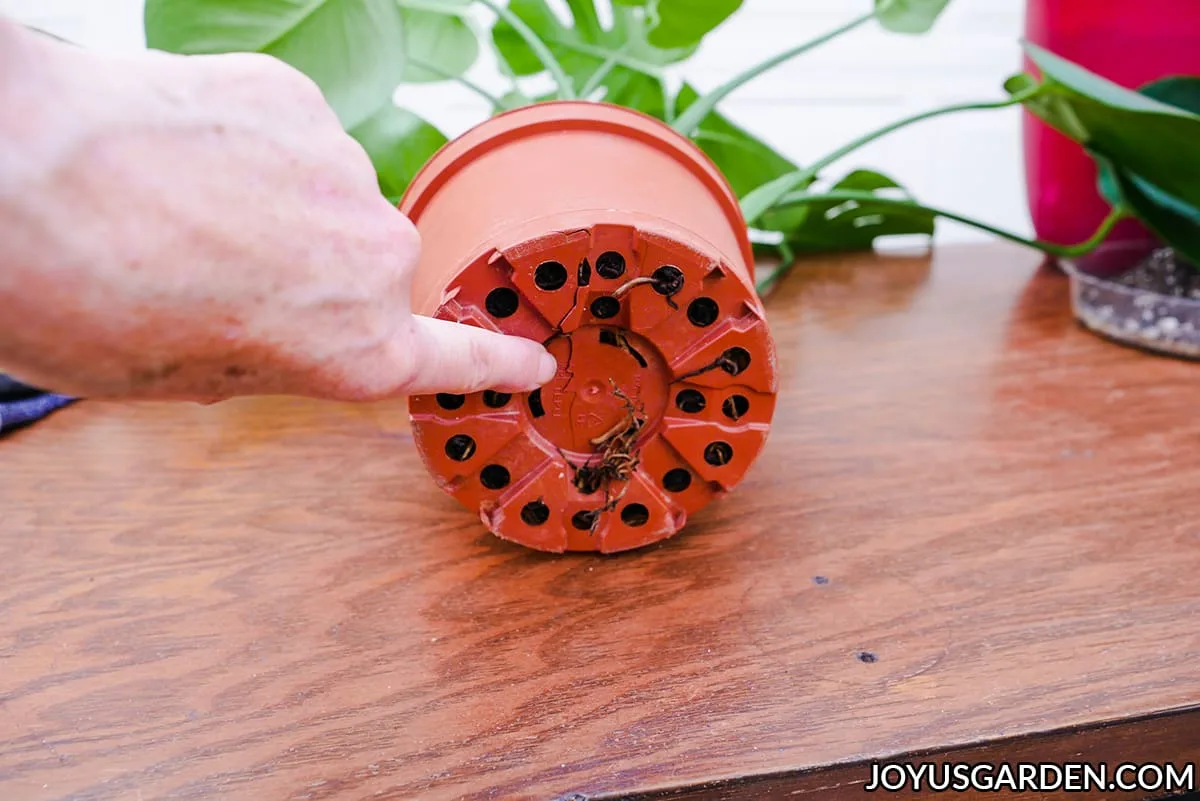 Gently massage the Monstera roots to loosen them a bit. The roots will eventually find their way out of the tangled root ball, which gives them a head start.