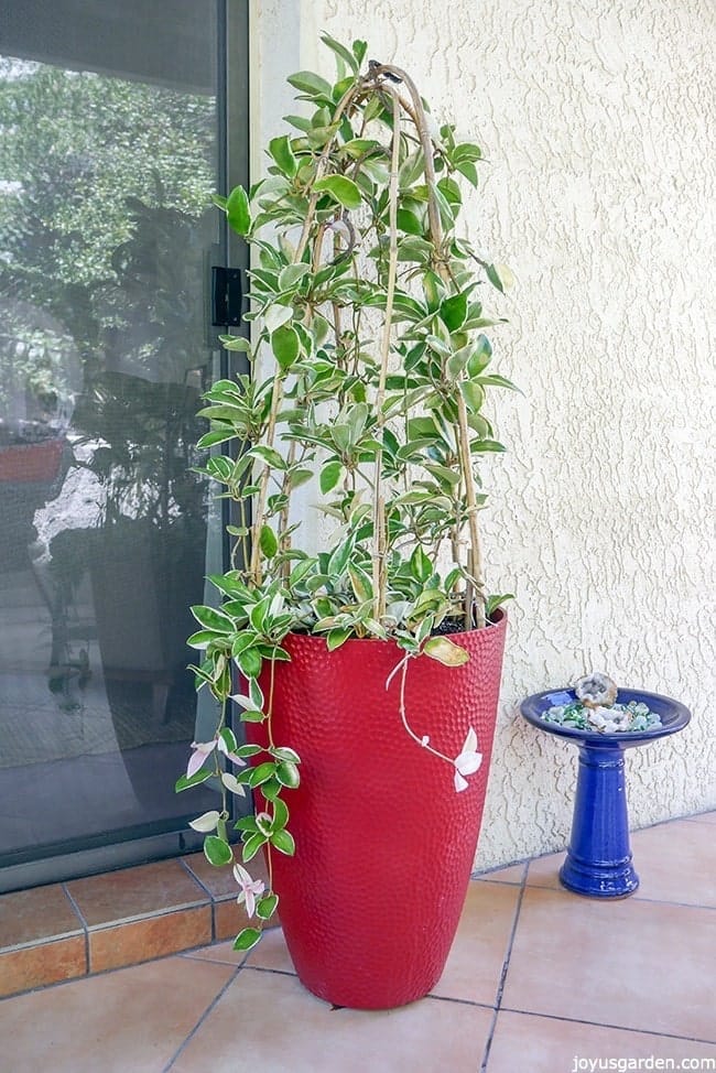 My Hoya topiary sits right by the sliding glass door. To the right of it is a low bird bath filled with colored glass chips & a couple of geodes which I got at the Tucson Gem & Mineral show. A little patio bling!
